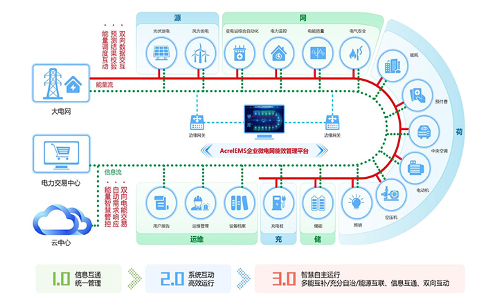 簡介:1.概述 通過在源、網(wǎng)、荷、儲、充的各個關鍵節(jié)點安裝監(jiān)測、分析、保護、治理裝置, 通過高性能邊緣計算網(wǎng)關采集數(shù)據(jù)并上傳至企業(yè)微網(wǎng)平臺。平臺根據(jù)新的電網(wǎng)價格、 用電負荷、電網(wǎng)調度指令等情況,調整各系統(tǒng)控制策略并遠程下發(fā),使企業(yè)微電網(wǎng)始終高效穩(wěn)定運行, 降低企業(yè)用電成本,實現(xiàn)能源互聯(lián)、信息互動。 2.應用場所 適用于各行業(yè)企業(yè)內(nèi)部微電網(wǎng)管理系統(tǒng)的新建、擴建、改建等項目。 3.平臺結構 3.平臺功能 安科瑞AcrelEMS企業(yè)微電網(wǎng)能效管理平臺融合了電力監(jiān)控、電氣安全、照明控制、能源管控、充電樁運營管理、分布式光伏監(jiān)測、儲能管理、設備臺賬、運維管理等功能,通過一個平臺、一個APP整體的對企業(yè)用電進行集中監(jiān)控、統(tǒng)一調度、統(tǒng)一運維,并且根據(jù)當?shù)毓╇姴块T錯峰避峰計劃提前為企業(yè)制定錯峰避峰方案和預警,滿足企業(yè)